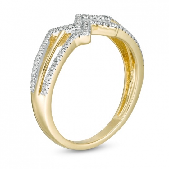 Crafted in warm 10K gold, this ring features a diamond-lined ribbon at the center. The polished ribbon completes the split, three-row setting. This ring features 1/8 carat diamonds polished to a brilliant shine for a bold statement.