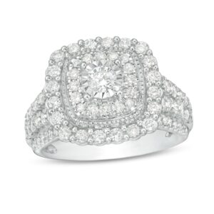 Dazzling rows of round diamonds surround a spectacular radiant-cut diamond center to create the main attraction in this stunning bridal. The 14K white gold band of the engagement ring and matching wedding ring gleam with twinkling diamonds, bringing the total diamond weight of the bridal set to 1 1/8 carats.