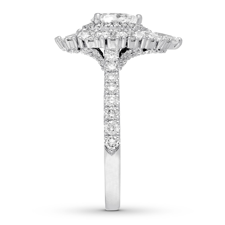 This breathtaking Neil Lane Studio engagement ring celebrates the glamour and elegance of the past. The dazzling center showcases a 1/2-carat pear-shaped diamond encircled by round diamonds. A burst of pear, round, and baguette diamonds completes the frame. Styled in polished 14K white gold, the ring has a total diamond weight of 1 7/8 carats.