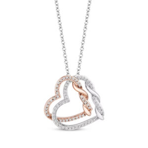 This enchanting diamond necklace serves as a beautiful reminder that through life's twists and turns, love keeps you centered. Featuring a stunning round center diamond and surrounded by an interwoven swirling design of diamonds, the pendant has a total diamond weight of 1/10 carat. The pendant is crafted of sterling silver and hangs on an 18-inch cable chain that secures with a spring ring clasp.